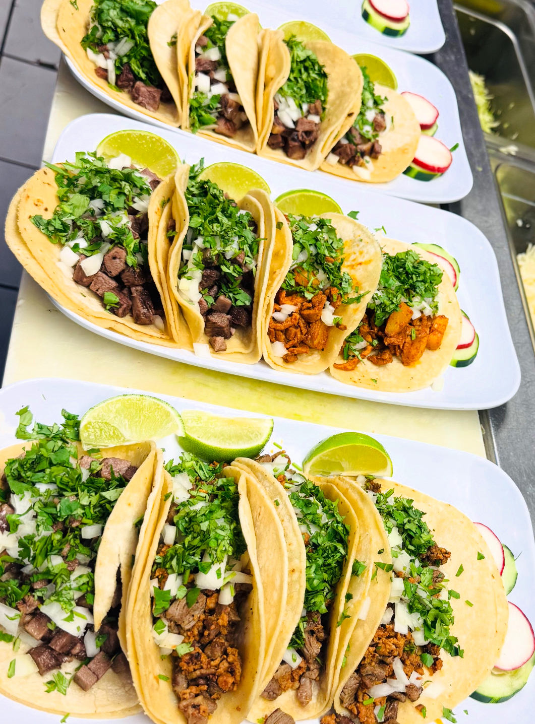 Grilled Beef, Grilled Chicken, Al Pastor, Spicy Pork, Roasted Pork, Mexican Sauasage (Chorizo), Cueritos, Cabeza, Tripa, Cesina, Shrimp, Fish and our two popular ALEX TACOS (With our traditional rice and chicken) and BIRRIA.